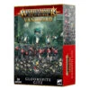 This set includes 20 six-sided, round-edged dice that measure 16mm along each edge. They are cast in a light, stony grey with black pips and an Ogor Mawtribes icon on each 6 face.