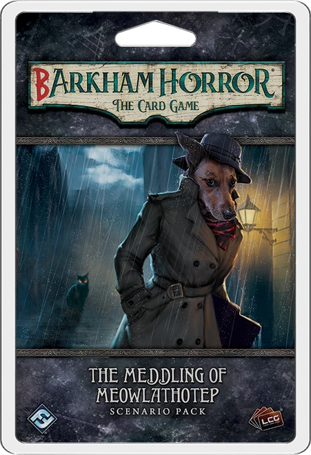 Barkham HorrorĀ is an alternate universe in which the conflict between humanity and the eldritch forces of the Mythos takes a back seat, and the conflict between dogs and cats takes center stage. InĀ The Meddling of Meowlathotep, a 78-card standalone scenario pack, the investigators must stop Meowlathotep, the Prowling Chaos, Meowsenger of the Outer Feline Gods, who is terrorizing the city of Barkham. Only a few precious pups can defeat the various Meowsks of Meowlathotep and prevent them from destroying Barkham and the world!Ā