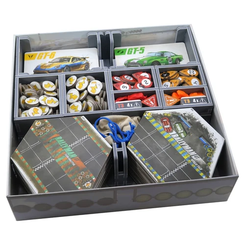 Insert compatible with Rallyman: GT®, including the Championship®, Team Challenge®, World Tour®, GT4®, GT5®, and Adrenaline Pack® expansions. The design provides both efficient storage and improved game play. The trays can be utilised during the game, and they greatly aid set-up and clear-away times.