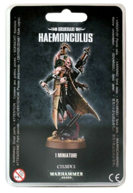 This 11-piece plastic kit makes one Haemonculus equipped with an array of deadly surgical instruments and a splinter pistol. His body is born aloft by a grotesquely elongated spine, as he drifts across the field of battle with a macabre elegance, gifting a slow and painful death to all those who cross its path. Â