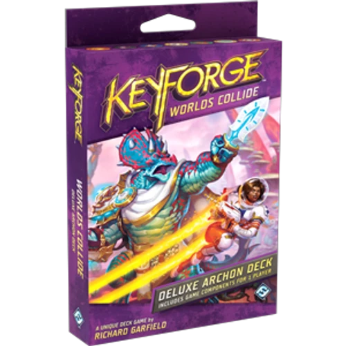 However, if you’re discovering the Crucible on your own, jumping in on the go, or just looking for some extra tokens, you will now be able to pick up the KeyForge: Worlds Collide Deluxe Archon Deck. This deluxe deck is the perfect first step into the world’s first Unique Deck Game. This box provides you with all the tools one player needs to either begin or expand their adventures on the Crucible, including one unique Worlds Collide Archon Deck, a Quickstart Rulebook, a chain tracker, three keys, and all the tokens required to begin your cosmic clashes!