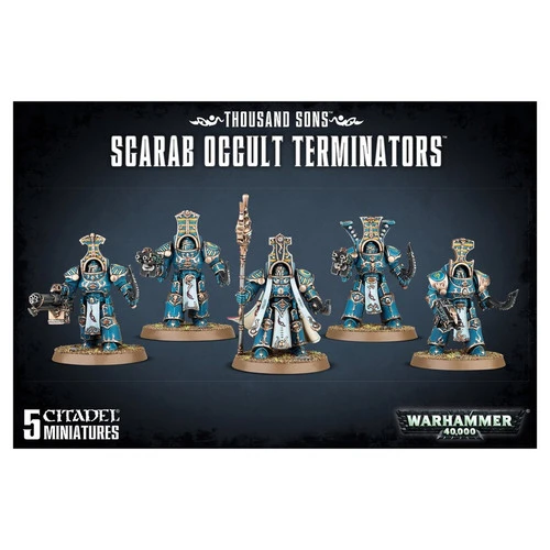 Multi-part plastic kit makes 5 Scarab Occult Terminators, armed with inferno combi-bolters and khopesh blades. Options for heavy warpflamer, soulreaper cannon, hellfyre missile rack and Scarab Occult Sorcerer. Supplied with 5 Citadel 40mm Round bases.